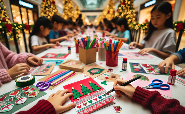 Dernière étape avant Noël ! Les lutins invitent les enfants à un atelier de cartes de Noël. Quelques mots délicatement choisis et soigneusement rédigés sur les cartes en accroche porte transformeront les sapins en totems de tendresse.